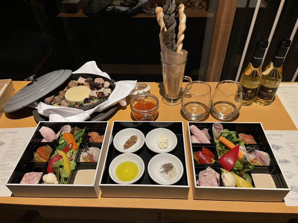 ごはんの時間になったので部屋に戻ったら、ちょうど持ってきてくれた!今回夜は部屋食プランだったので、セッティングしてくださり、外を見ながらゆったりディナーした😊